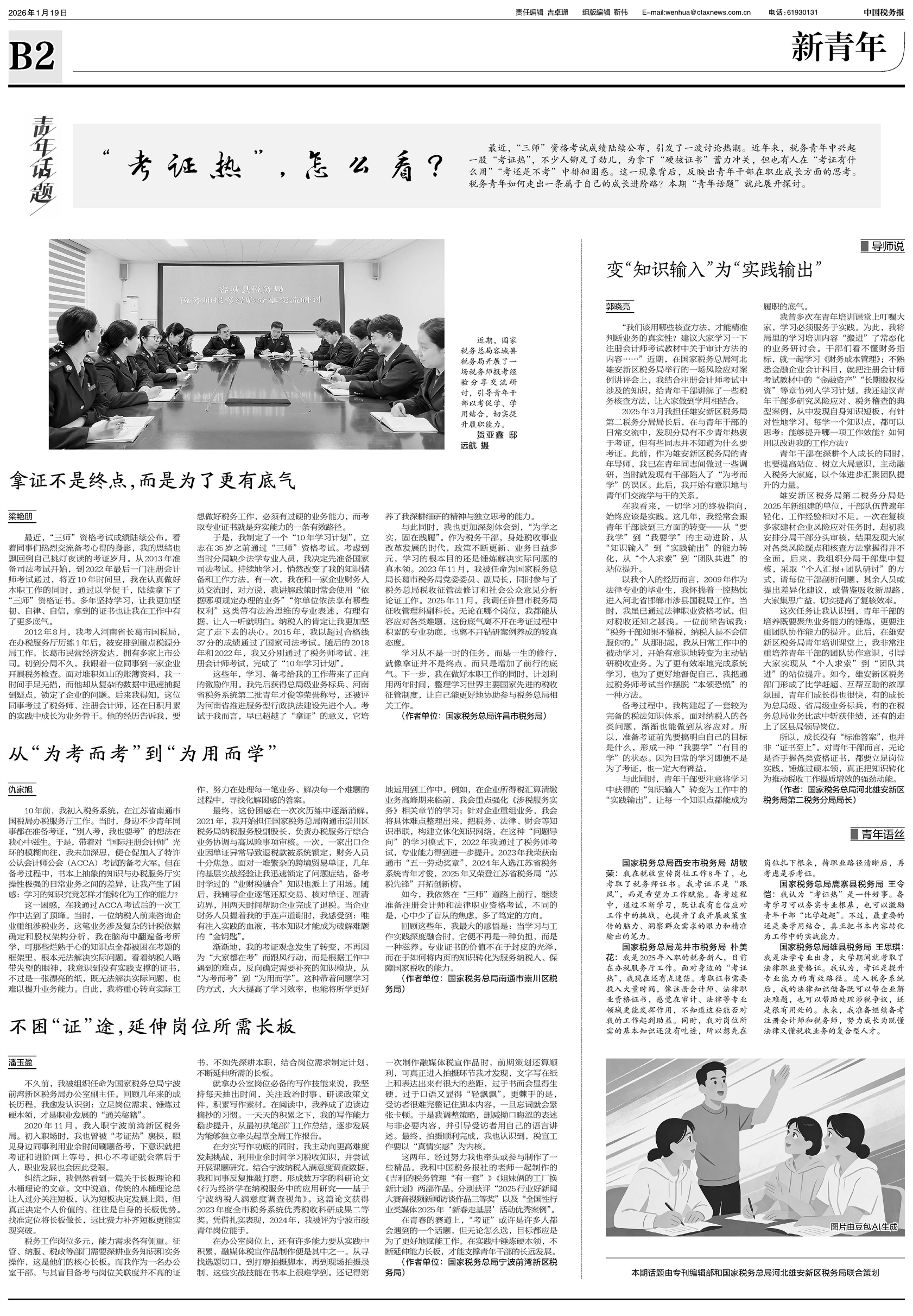 最近,“三师”资格考试成绩陆续公布,引发了一波讨论热潮。近年来,税务青年中兴起一股“考证热”,不少人铆足了劲儿,为拿下“硬核证书”蓄力冲关,但也有人在“考证有什么用”“考还是不考”中徘徊困惑。这一现象背后,反映出青年干部在