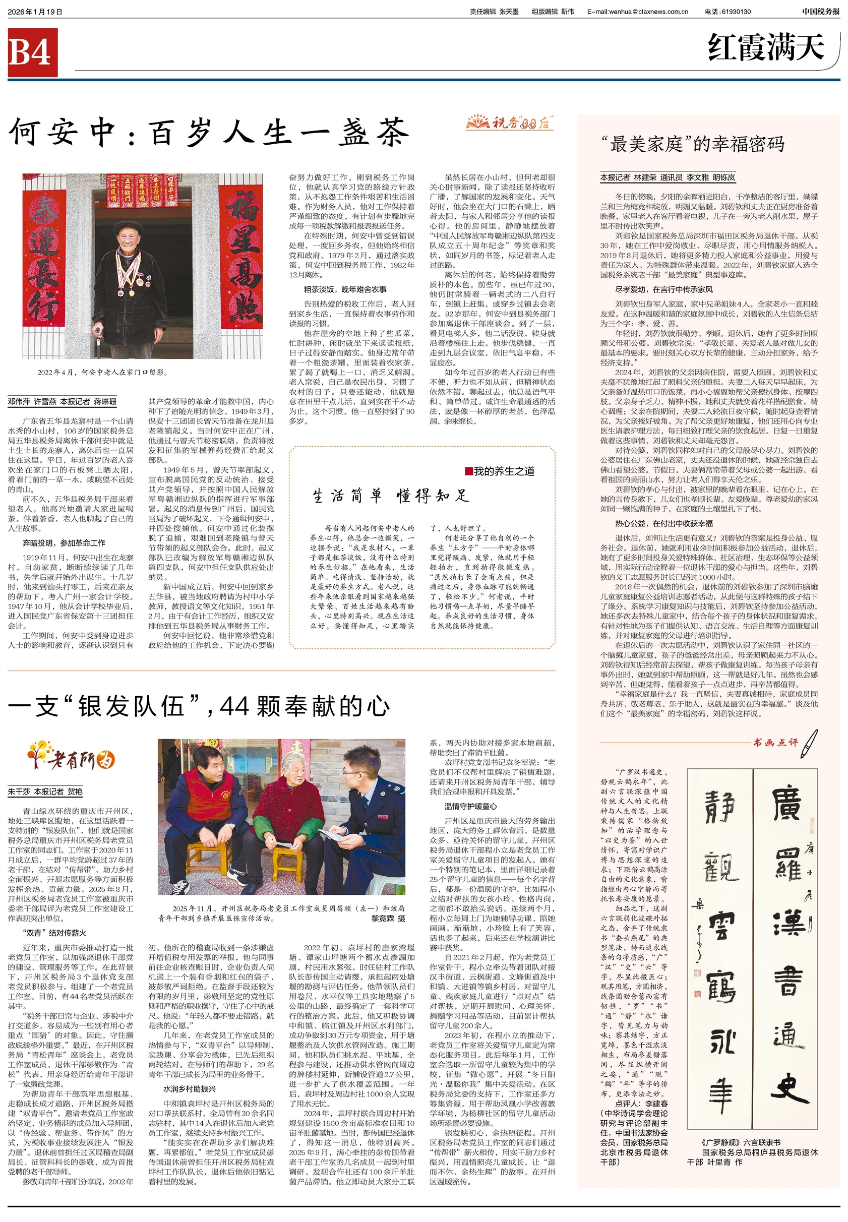 广东省五华县龙寨村是一个山清水秀的小山村,106岁的国家税务总局五华县税务局离休干部何安中就是土生土长的龙寨人,离休后也一直居住在这里。平日,年过百岁的老人喜欢坐在家门口的石板凳上晒太阳,看着门前的一草一木,或眺望不远处的