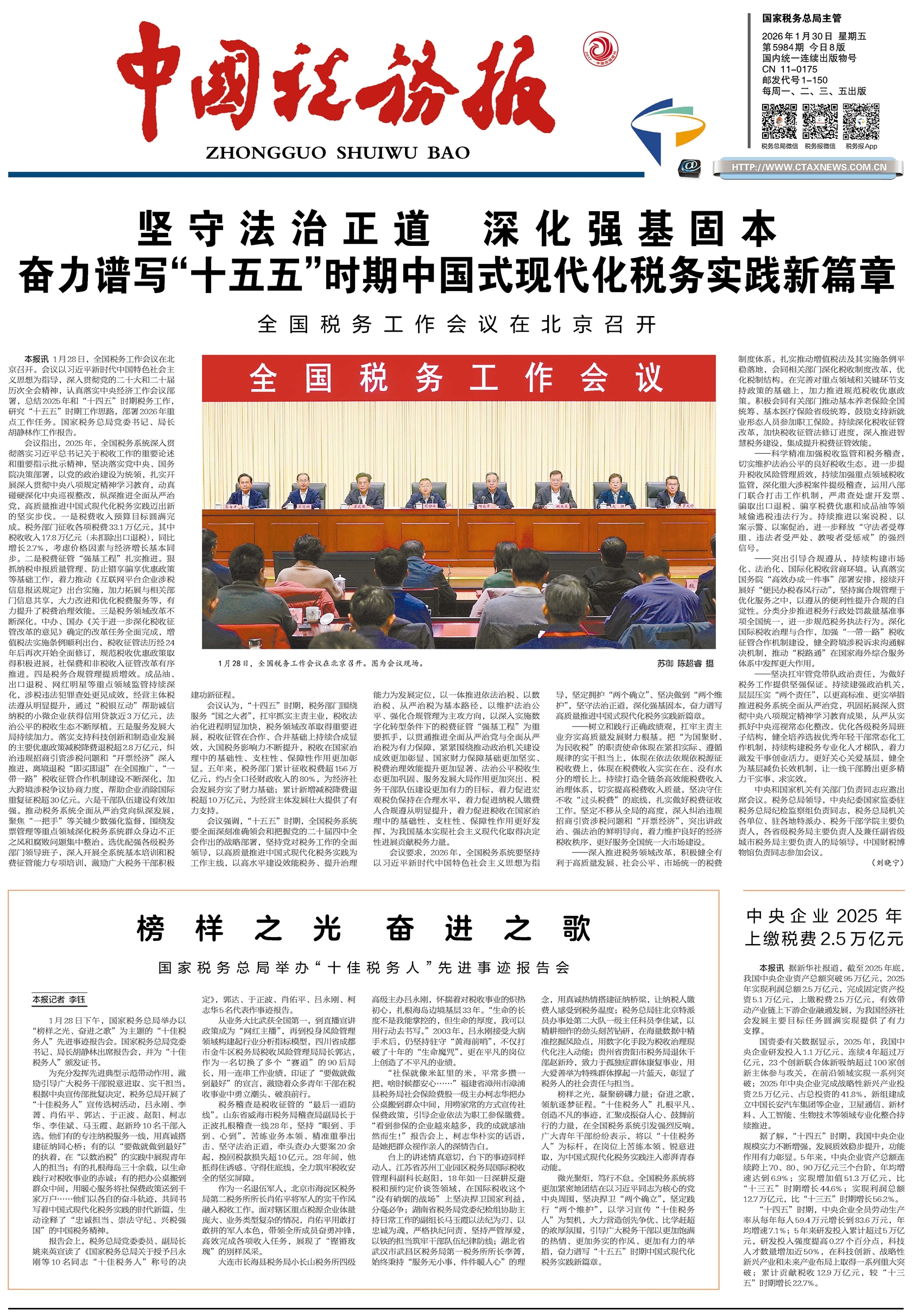 本报讯 1月28日,全国税务工作会议在北京召开。会议以习近平新时代中国特色社会主义思想为指导,深入贯彻党的二十大和二十届历次全会精神,认真落实中央经济工作会议部署,总结2025年和“十四五”时期税务工作,研究“十五五”时期