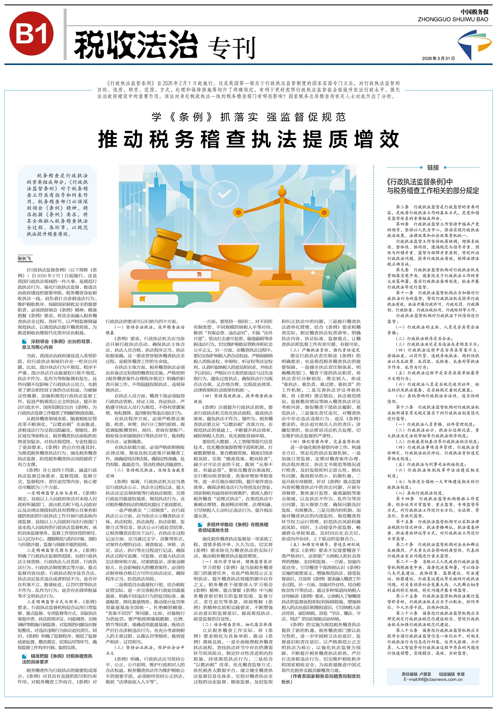 税务稽查是行政执法的重要组成部分,《行政执法监督条例》对于税务稽查工作具有指导和约束作用。税务稽查部门必须深刻领会《条例》精神,精准把握《条例》要求,将其全面融入税务稽查执法全过程、各环节,以规范执法提升稽查质效。