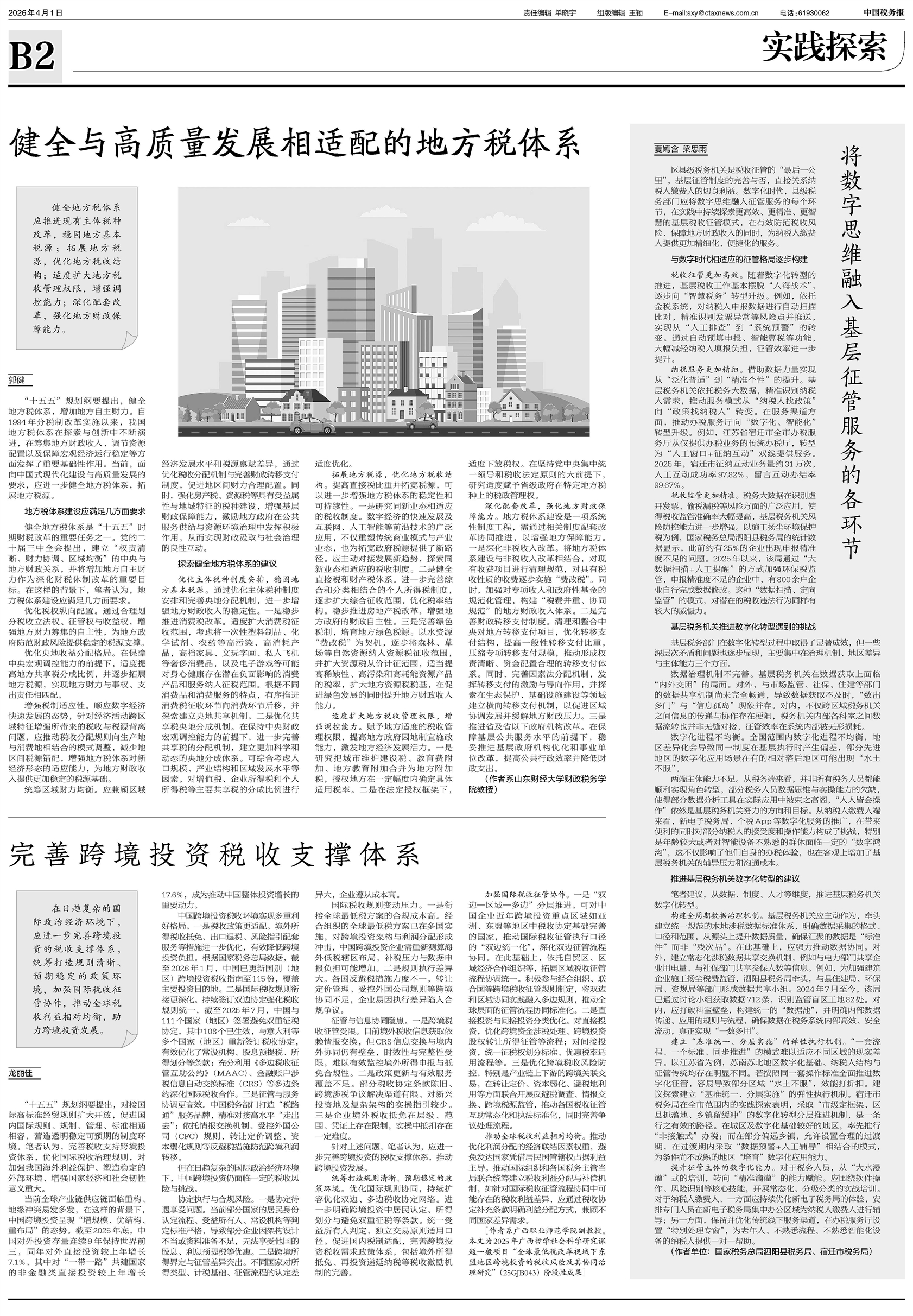 区县级税务机关是税收征管的“最后一公里”,基层征管制度的完善与否,直接关系纳税人缴费人的切身利益。数字化时代,县级税务部门应将数字思维融入征管服务的每个环节,在实践中持续探索更高效、更精准、更智慧的基层税收征管模式,在有效
