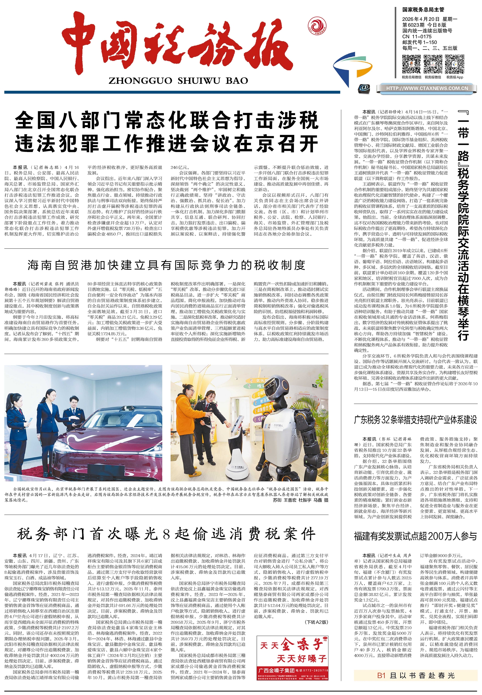 本报讯(记者杨志聪)4月16日,税务总局、公安部、最高人民法院、最高人民检察院、中国人民银行、海关总署、市场监管总局、国家外汇局八部门在北京召开全国常态化联合打击涉税违法犯罪工作推进会议。会议深入学习贯彻习近平新时代中国特