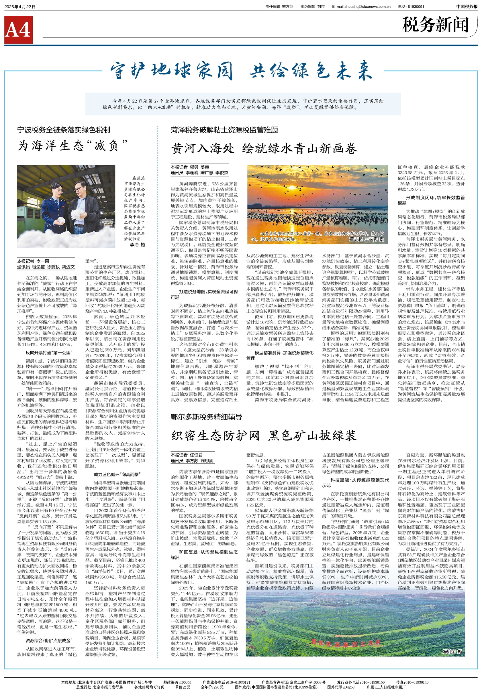 今年4月22日是第57个世界地球日。各地税务部门切实发挥绿色税制促进生态发展、守护碧水蓝天的重要作用,落实落细绿色税制要求,以“约束+激励”的机制,精准助力生态治理,为黄河安澜、海洋“减塑”、矿山复绿提供坚实保障。