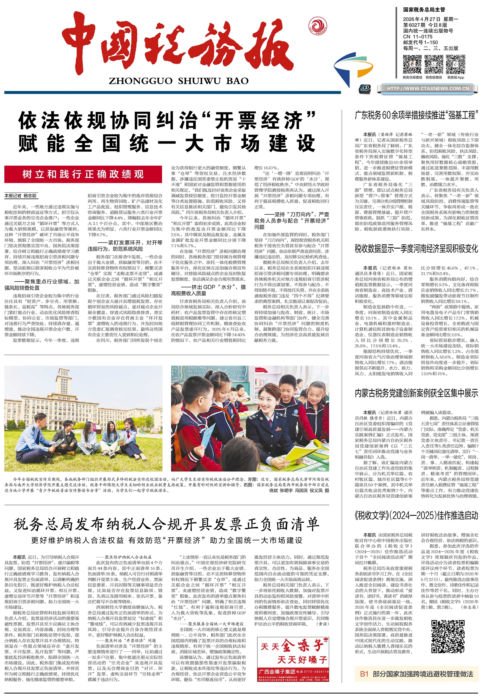本报讯 近日,为引导纳税人合规开具发票,防范“开票经济”、虚开骗税等问题,国家税务总局结合开展树立和践行正确政绩观学习教育,发布纳税人合规开具发票正负面清单,以清晰明确的条目化指引,既更好维护纳税人合法权益,又促进纠治循环